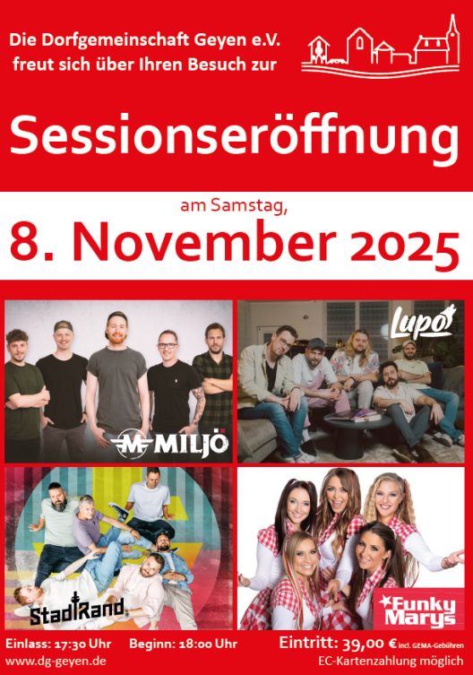 Am Samstag, 08.11.2025 feiern wir den Beginn der fünften Jahreszeit wie immer im Schützenhaus in Geyen und freuen uns auf tolle Künstlerinnen und Künstler. Unter anderem sind dabei: Miljö, Lupo, Stadtrand, die Funky Marys und unsere lieben Höppemariechen.